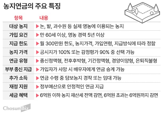 농지연금은 만 60세 이상 농업인이 소유한 농지를 담보로 매달 연금을 받을 수 있는 제도로, 주택연금과 비슷하다. 만 60세 이상부터 5년 이상(전체 영농기간 합산) 영농경력이 있다면 가입할 수 있다. 가입 후에도 농사를 계속 지을 수 있고, 사망 후에도 상속인이 농지 및 연금을 승계하면 부담 없이 연금을 활용할 수 있다는 게 특징이다.