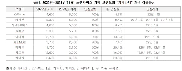 8개 브랜드(▲스타벅스 ▲커피빈 ▲투썸플레이스 ▲폴바셋 ▲이디야 ▲메머드 ▲컴포즈 ▲빽다방)는 2년간 400~500원 인상했다. 같은 기간 메가MCG커피는 200원 인상했다. 커피빈은 2년간 3차례 가격을 인상했는데 올해는 라테 제품만 200원씩 인상을 단행했다.