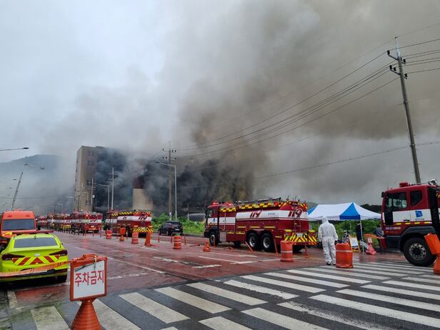 쿠팡 덕평물류센터 화재로 수도권 물류 허브인 덕평 물류단지의 물동량이 일제히 멈췄다. 물류단지로 들어가는 덕평로 갓길엔 물류센터에 들어가지 못한 컨테이너 차량이 멈춰 서 있었다. 물류차량 진입이 막힌 물류센터 앞 도로는 소방차로 가득했다. 이날 화재 진압 작전에 투입된 장비는 모두 196대. 펌프 방수차 20대와 굴절 사다리차 13대가 건물을 둘러싼 채 물을 뿌리고 있었다. 탱크를 비운 소방차들은 바로 교대하며 방수 작업을 계속 이어갔다.