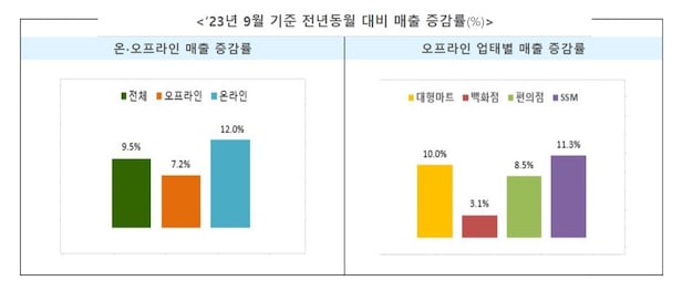 30일 산업통상자원부가 발표한 '2023년 9월 주요 유통업체 매출동향'에 따르면 지난달 주요 유통업체 매출은 오프라인이 7.2%, 온라인이 12.0% 증가하면서 전체 매출이 전년 동월 대비 9.5% 상승했다.