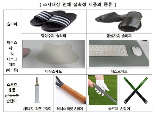 한국소비자원이 슬리퍼와 마우스패드, 라켓 손잡이 등 합성수지와 합성가죽 제품에서 유해물질이 검출됐다고 12일 밝혔다.