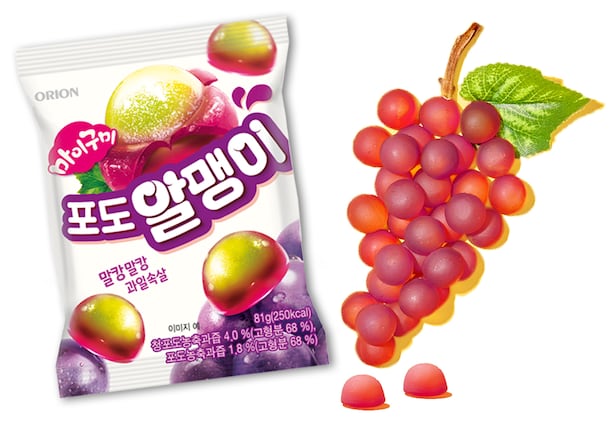 '포도알맹이'는 기존 오리온(271560)의 과일맛 젤리 '마이구미'의 식감을 차별화한 제품으로, 젤리의 겉과 속을 서로 다른 식감으로 구성한 게 특징이다.