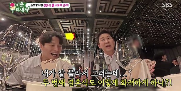 While sitting at the guest table, Shin Dong-yeob jokingly asked, 'I don't really know, but do you really have a second wedding like this?' Seo Jang-hoon also exclaimed, 'It seems like there are over 100 people just to oversee this venue,' expressing surprise at the scale of the guests. The wedding ceremony began, and the moment Kim Dae-hee walked in holding Kim Ji-min's hand in place of her late father achieved an impressive 4.2% viewership rating in the 2049 demographic.