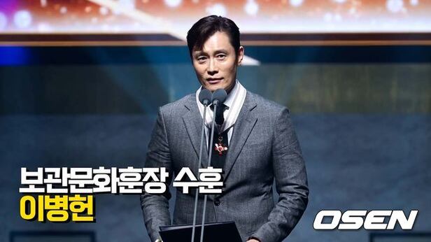 Actor Lee Byung-hun is delivering remarks upon receiving the Bogwan Cultural Medal.