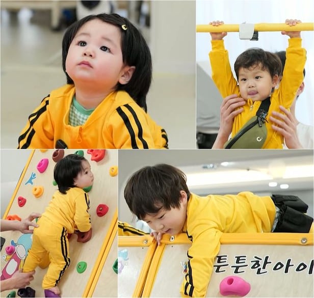 Buoyed by strong momentum, Haru challenges a climbing wall with a 60-degree incline. Jungwoo cheers, "Haru, you can do it," and Kim Jun-Ho encourages him, "It's not hard. It's confidence! Try it once!" Haru stretches out his adorable hand to grip the holds firmly and begins to step up one foot at a time. Kim Jun-Ho cannot stop praising him, saying, "He's strong. He has grit. The fact that he can hold on and climb is amazing."