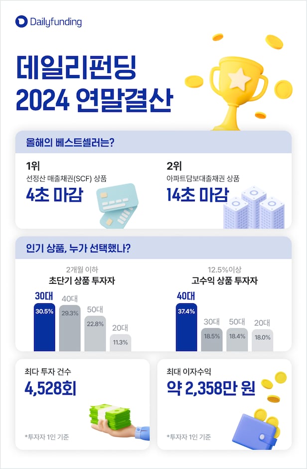 Daily Funding, an online investment-linked finance company, released data on the '2024 annual investment review' on the 6th, revealing the preferences of investors by age group as well as records from the past year. The data was compiled based on 17,568 mid-interest investment products handled by Daily Funding in 2024.