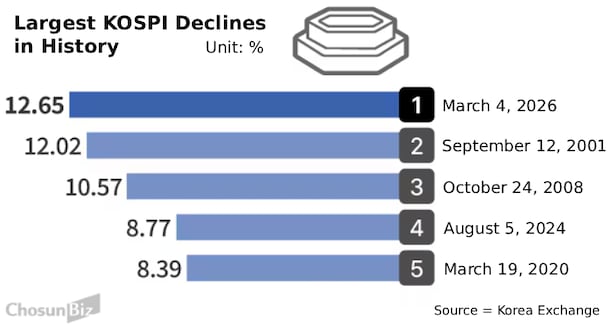On the 4th, the KOSPI plunged more than 12% intraday, marking a record drop. Geopolitical risk stemming from the U.S. strike on Iran spread across the market, sharply denting investor sentiment.