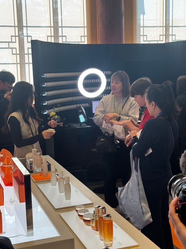 LG H&H's "The History of Whoo" lounge drew attention with palace-inspired decor and mother-of-pearl lacquerware craftsmanship. When Son Dae-hyeon, a Seoul Metropolitan Government intangible cultural asset and master of ottchil lacquer, gave a demonstration, foreign visitors gasped in admiration.