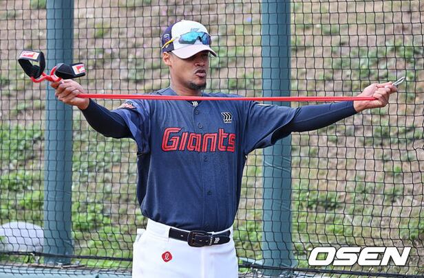 Lotte's Elvin Rodriguez loosens up with a tubing band. 2026.02.02