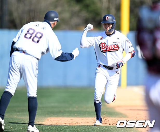 With two outs and a runner on first in the bottom of the seventh, Doosan's Park Ji-Hoon hits a two-run homer to right and celebrates. Mar. 13, 2026