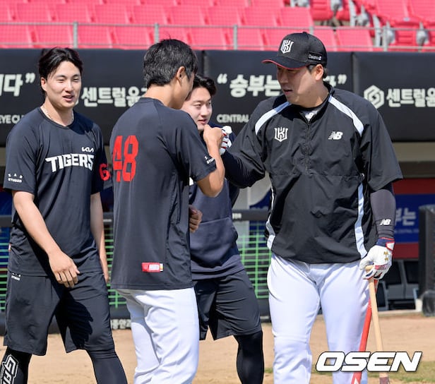 Before the game, KIA's Lee Eui-lee, Yoon Do-hyun, and Jung Hae-young exchanged high-fives with KT's Kim Hyun-soo. Mar. 14, 2026