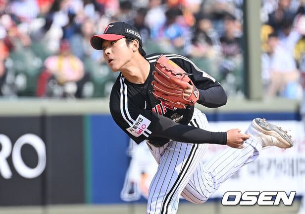 LG Twins' Woo Kang-hoon is delivering a powerful pitch. Mar. 15, 2026
