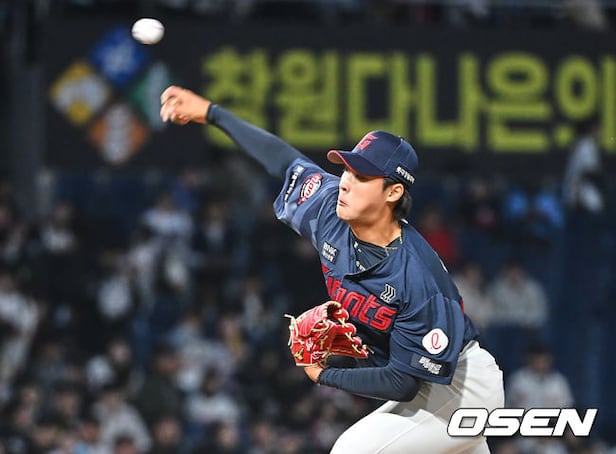 Lee Min-seok of the Lotte Giants is pitching powerfully. Mar. 31, 2026