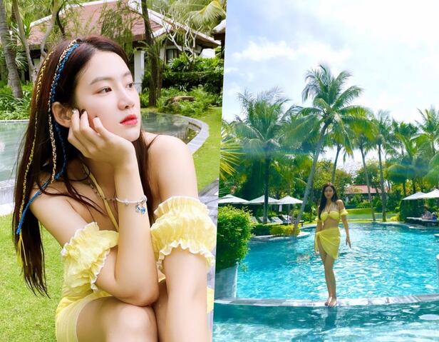 사진 속 박주현은 노란색 비키니를 입고 휴양지에서 휴가를 즐기고 있다. 노란색 비키니에 완벽한 몸매 라인을 드러내면서도 금색과 파랑으로 포인트를 준 헤어스타일과 발랄한 팔찌 포인트까지 즐거운 휴가 분위기를 만끽하고 있다.