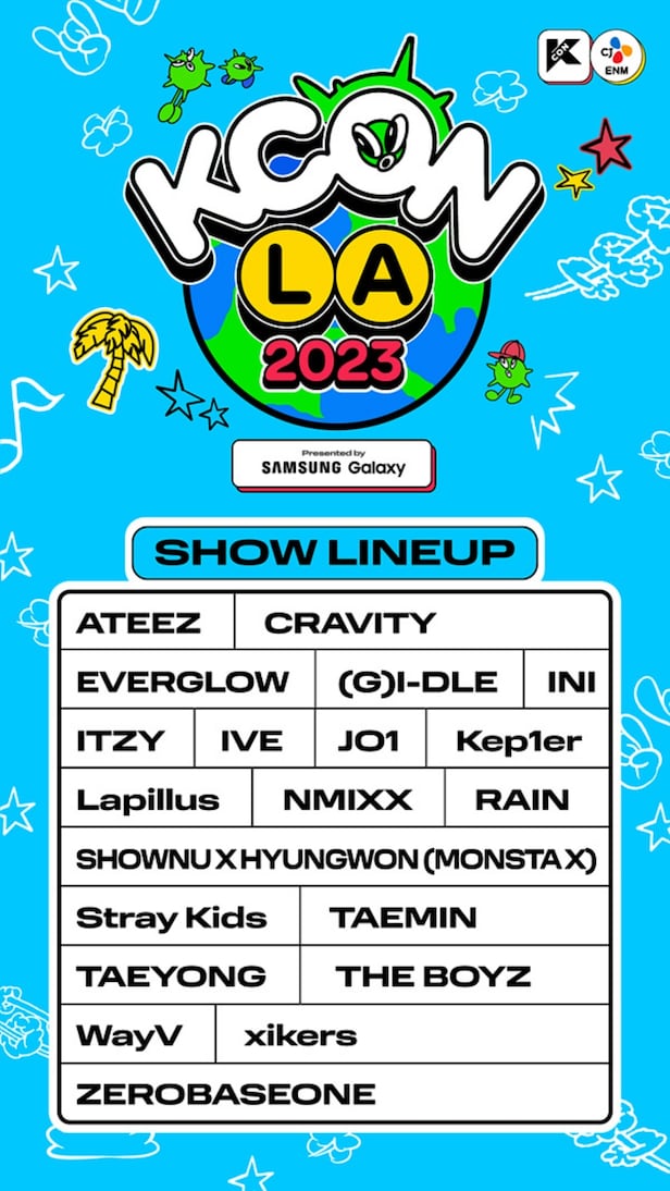 이번 'KCON LA 2023' 쇼에 오를 아티스트 라인업은 에이티즈(ATEEZ), 크래비티(CRAVITY), 에버글로우(EVERGLOW), (여자)아이들((G)I-DLE), INI, 있지(ITZY), 아이브(IVE), JO1, 케플러(Kep1er), 라필루스(Lapillus), 엔믹스(NMIXX), 비(RAIN), 셔누 X 형원(몬스타엑스)(SHOWNU X HYUNGWON(MONSTA X)), 스트레이 키즈(Stray Kids), 태민(TAEMIN), 태용(TAEYONG), 더보이즈(THE BOYZ), 웨이션브이(WayV), 싸이커스(xikers), 제로베이스원(ZEROBASEONE) 등 20팀.(*아티스트 나열 ABC 순) 일찍이 글로벌 무대에 진출해 K-POP 글로벌화의 초석을 닦은 레전드 아티스트부터 글로벌에서 활약을 펼치고 있는 막강한 차세대 아티스트까지 K-POP 스타들이 대거 출연해 다채로운 무대를 선보일 것으로 기대된다.