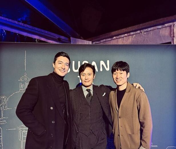 배우 이병헌이 부산에서 배우 다니엘 헤니, 그리고 전 축구 선수 박지성과 함께한 사진을 공개했다.