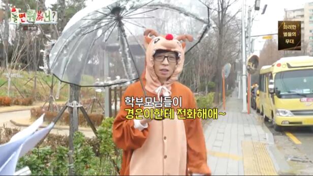유재석은 "아니 진짜 창피하게. 옷도 창피한데, 우산도 창피하다"면서 거울을 봐 웃음을 자아냈다. 이어 "여기 유치원 등원시간이에요. 학부모들이 경은이한테 전화해, 남편 지금 저러고 다닌다고. 사진 찍어서"라고 덧붙였다.