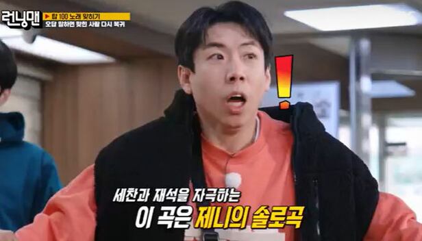 '런닝맨'에서 양세찬이 함께 예능에 출연 중인 제니의 노래를 맞히지 못 하곤 제니를 소환해 사과했다.
