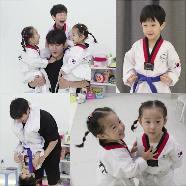 이 가운데 재율이가 꼬마 태권도 사범님으로 변신해 쌍둥이 동생 아윤-아린에게 태권도 기술을 전수한다. 먼저 재율은 양손으로 주먹을 불끈 쥐며 준비 자세를 취하고, 우렁차게 기합까지 내지르며 시범을 보인다. 또한 재율은 180도 다리를 찢는 기술로 남다른 유연성까지 뽐낸다. 이에 아윤은 "안녕하심니까. 저눈 효녀입니다"라며 오빠를 따라 열심히 인사를 하고, 깜찍한 기합 소리를 선보인다. 특히 아윤-아린은 스트레칭부터 발차기 포즈까지 똑같은 '데칼코마니' 포즈로 완벽한 쌍둥이의 찰떡 호흡을 자랑한다고.