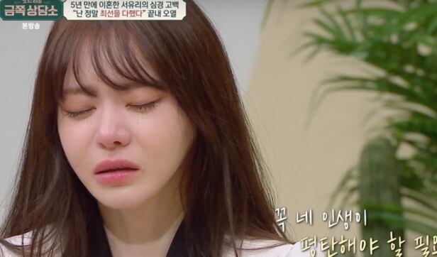 오은영은 "누구에게나 이혼의 과정은 힘든 것, (이런 아픔이) 당연하다"며 위로했다. 서유리는 "심리상담 등 내가 할 수 있는건 다 했다, 최선을 다했기에 후회도 없다"고 했다. 각고의 노력에도 좁?�지 않았기에 이혼을 결정했다는 서유리는 "전 정말 최선을 다했다"며 재차 강조하며 끝내 터진 눈물에 오열했고, 서유리를 배려하기 위해 쉬어가는 타임을 가지며 녹화를 중단했다.