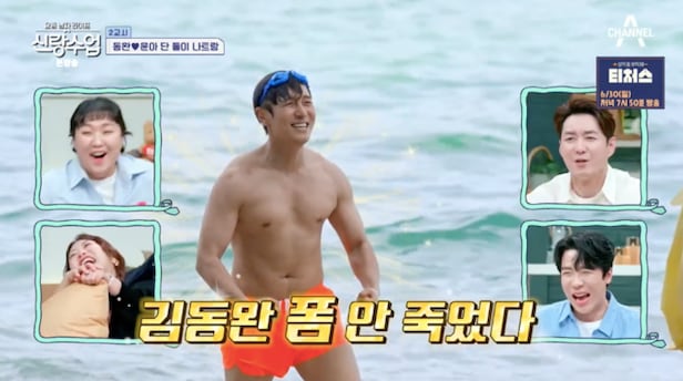 19일 방송된 채널A 예능 '요즘 남자 라이프-신랑수업'(이하 '신랑수업')에서는 첫 해외여행을 떠난 김동완이 서윤아 앞에서 등근육을 과시한 모습이 그려졌다.