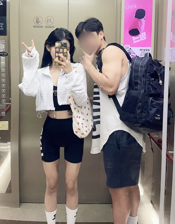 최준희는 블랙 숏 레깅스에 브라톱, 그리고 화이트 커버를 입고 나시 티셔츠의 남자친구와 엘레베이터에서 브이 포즈를 취하고 있다. 마른 몸매에서도 느껴지는 근육질 라인은 그의 남다른 노력을 보여주며 감탄을 더한다.