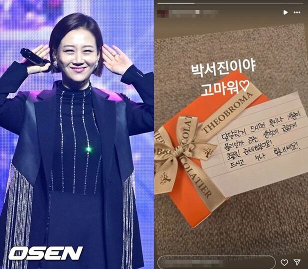 사진에는 박서진으로부터 받은 선물이 담겼다. 선물은 달콤한 초콜릿으로, 박서진은 "달달한 거 드시면 혹시나 기분이 풀리실까 하는 생각에 급하게 초콜릿 준비해써요! 드시고 누나 힘내세요"라고 편지를 적었다.