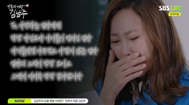 이 모습을 본 김남주는 상위 1% 영재로 알려진 딸을 언급하며 "우리 딸이 이랬으면 좋겠다"라고 말해 눈길을 끌었다. 또, 이날 김남주는 제작진이 준비한 생일 깜짝 이벤트를 받았고 아들이 남긴 편지를 읽으며 눈물을 쏟았다.