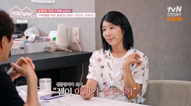 13일 전파를 탄 tvN STORY ‘각집부부’에서는 일본어 공부에 나선 김정민의 모습이 그려졌다.