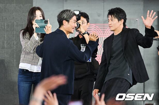 한효주가 야외무대인사를 마치고 포토 타임에서 츠키카와 쇼 감독과 오구리 ?��? 촬영해 주고 있다. 2025.09.20
