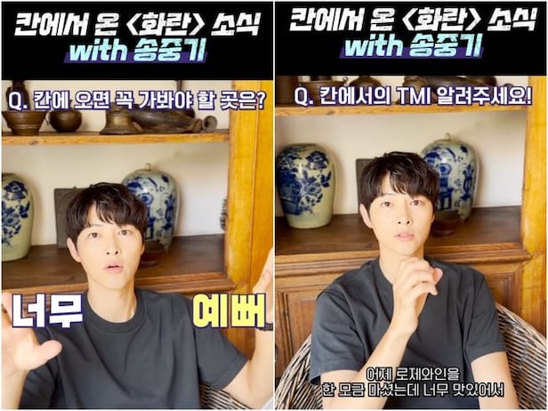 영상 속 '칸에 오면 꼭 가봐야 할 곳은?'이란 질문에 송중기는 "칸에는 구시가지와 신시가지가 있다. 현재 촬영하고 있는 곳이 구시가지인데 너무 예뻐. 신시가지도 매력 있는데 이 쪽은 또 다른 매력이 있더라구요"라고 대답했다. "그래서 칸에 놀러 오실 분들은 구시가지 강력 추천합니다"라고 덧붙였다.
