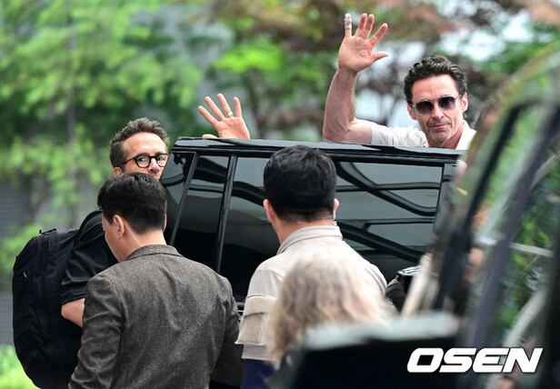 할리우드 배우 라이언 레이놀즈와 휴 잭맨이 입국장을 나서며 인사하고 있다. 2024.07.03 / dreamer@osen.co.kr