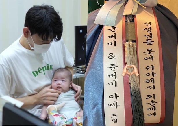 10일 제이쓴은 자신의 인스타그램 스토리에 '선생님들 옷에 쉬야해서 죄송해요. 준버미 & 준버미 아빠 드림'이라는 글씨가 적힌 리본을 단 선물을 공개했다. 이와 함께 손하트 이모티콘을 더해 남다른 정성이 느껴지게 했다.