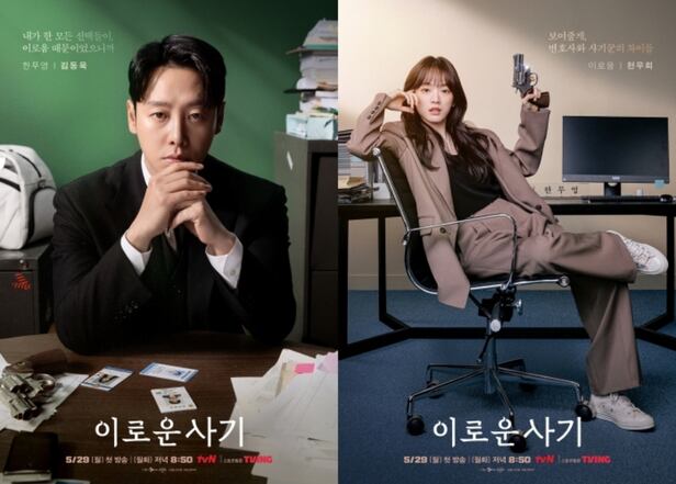 tvN 새 월화드라마 '이로운 사기(극본 한우주, 연출 이수현)'에서 공감 불능 사기꾼 이로움 역을 맡은 천우희와 과공감 변호사 한무영을 연기할 김동욱의 캐릭터 포스터를 공개한 것.