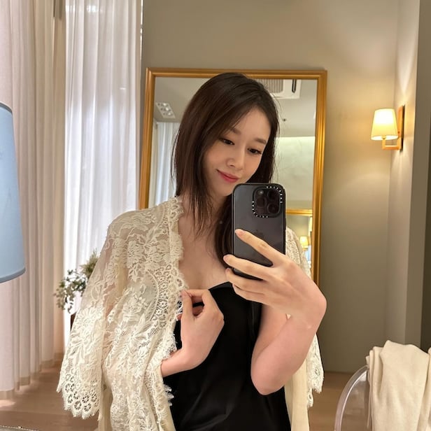공개된 사진 속 지연은 블랙 튜브톱 의상을 입고 레이스 실크 가운을 걸치고 있는 모습이다. 고혹적인 모습으로 거울 셀카를 찍고 있는 지연은 이내 은은한 미소를 지어 보는 이를 매료했다.