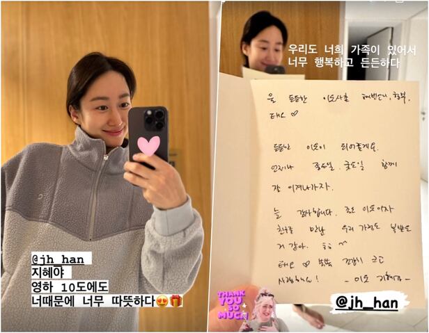 지난 10일 전혜빈은 자신의 인스타그램 스토리에 "지혜야 영하 10도에도 너때문에 너무 따뜻하다"라며 배우 한지혜를 태그했다. 이어 "우리도 너희 가족이 있어 너무 행복하고 든든하다"라며 한지혜로부터 받은 쪽지를 공개했다.