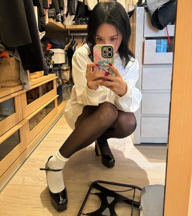 공개된 사진 속 엄정화는 흰 셔츠에 검은 망사 스타킹을 신은 채 쭈그려 앉아 거울 셀카를 찍고 있다. 검은색 구두를 신고 있는 엄정화는 한쪽 발에만 흰 양말을 신고 있다. 구두에 양말을 신을지 말지 고민하고 있는 듯 진중한 표정을 하고 있는 엄정화의 모습이 눈길을 끈다.