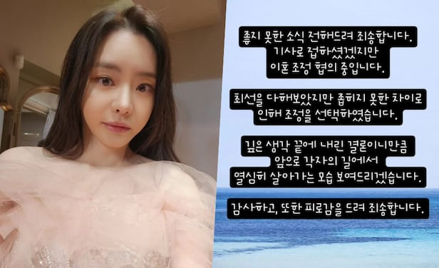 이후 31일 서유리는 SNS를 통해서도 "이혼 조정 협의 중이다. 최선을 다해봤지만 좁히지 못한 차이로 인해 조정을 선택했다"라며 "깊은 생각 끝에 내린 결론이니만큼 앞으로 각자의 길에서 열심히 살아가는 모습 보여드리겠다"라고 입장을 밝혔다.