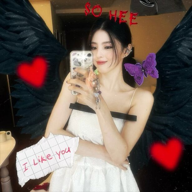 공개된 사진 속 한소희는 화이트 끈 원피스를 입고 거울 셀카를 찍고 있다. 한소희는 카메라 앱을 이용해 검은 천사 날개와 보라색 나비 등 이미지를 덧붙여 눈길을 끌었다. 백옥 같은 피부에 고혹적 메이크업을 하고 있는 한소희는 보는 이를 매료하는 미모로 시선을 강탈했다.
