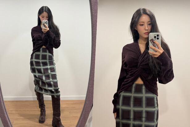 공개된 속 사진 속 효민은 복부가 살짝 드러난 자켓에 체크 패턴 스커트를 입고 거울 셀카를 찍고 있다. 일상룩마저도 모델처럼 소화한 효민은 살짝 드러낸 잘록한 허리와 우월한 골반 라인으로 시선을 강탈했다.