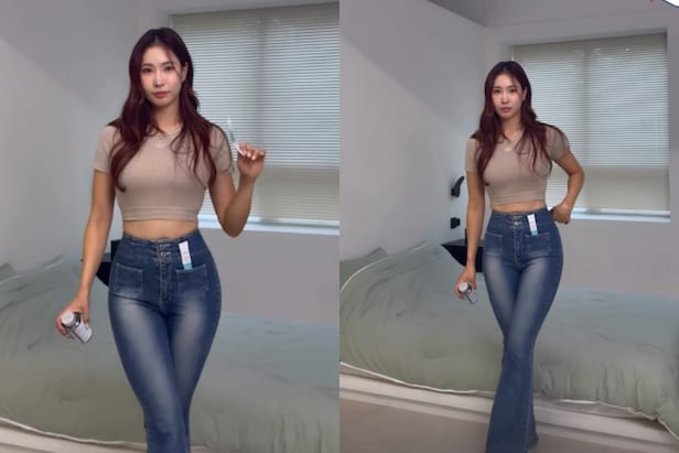공개된 영상 속 유현주는 누드톤 크롭톱에 부츠컷 데님 팬츠를 입고 카메라를 향해 다가오고 있다.