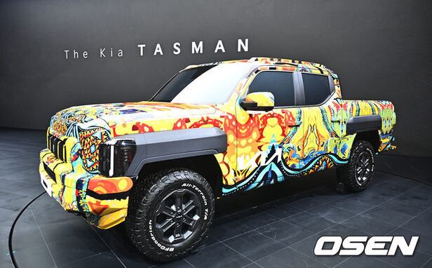기아는 이번 부산모빌리티쇼에서 브랜드 첫 정통 픽업 '더 기아 타스만'의 전용 위장막 모델 실물을 국내 최초로 공개했다.