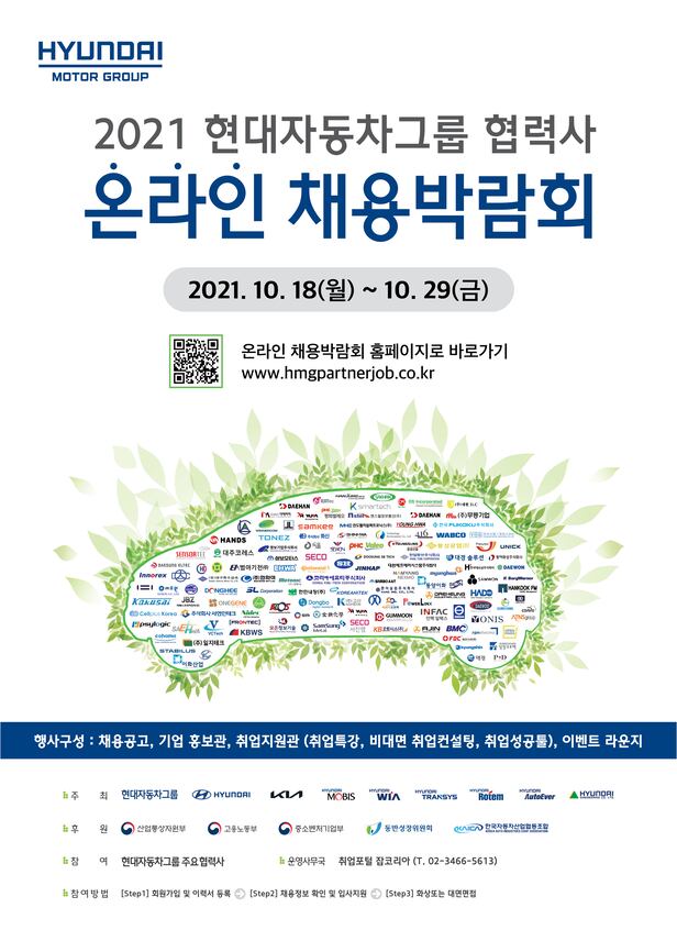 17일 현대차그룹에 따르면 '2021 현대자동차그룹 협력사 온라인 채용박람회'가 오는 18∼29일 2주간 개최된다. 올해 10회째를 맞이한 이번 박람회는 대기업이 지원하는 국내 첫 협력사 채용박람회다. 채용 상담 등이 실제 채용으로 연결되도록 현대차그룹이 행사 기획·운영까지 재정적 지원을 전담한다.
