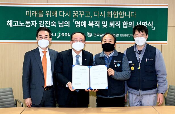 23일 HJ중공업에 따르면 이날 오전 HJ중공업 부산 영도조선소에서 금속노조와 김진숙의 명예 복직과 퇴직에 합의하고 서명식을 했다. 김 위원의 명예 복직과 퇴직 행사는 25일 오전 11시 영도조선소에서 열릴 예정이다.