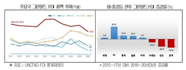 미중 무역전쟁(2018년 3월) 시점을 기준으로 이전 3년간 그린필드 FDI 평균과 이후 3년간의 평균을 비교해보면, EU 지역 내 그린필드 FDI 증가율은 47.0%로 1위였다. 이어 중국(13.5%), 일본(12.1%), 미국(5.7%) 등의 순이었다. 한국은 반대로 32.6% 감소했다.