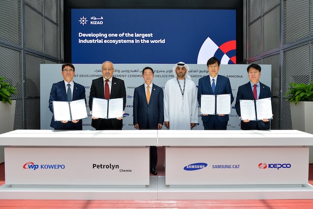 한국전력(015760)과 삼성물산(028260), 서부발전은 지난달 31일 아랍에미리트(UAE) 키자드 산업단지의 키자드 본사에서 UAE 개발사인 페트롤린케미와 UAE 키자드 그린 수소·암모니아 사업 공동개발협약을 체결했다고 2일 밝혔다.