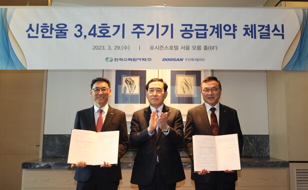 산업통상자원부는 29일 "발전사인 한국수력원자력과 공급사인 두산에너빌리티 간 신한울 3·4호기 주기기 계약이 체결돼 10년간 약 2조 9000억 원 규모의 기자재 제작이 본격 시작된다"고 밝혔다. 원전 주기기는 핵분열을 통해 열을 발생시키는 원자로, 발생된 열로 증기를 생산하는 증기발생기, 증기로 전력을 생산하는 터빈발전기 등으로 구성된다.