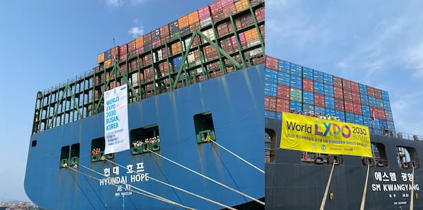 한국해운협회는 최근 부산신항에 정박한 HMM '현대 호프호'와 SM상선의 '에스엠 광양호'에 2030 부산 엑스포 유치를 기원하는 대형 현수막을 설치했다. 김세현 한국해운협회 부산사무소장은 "해운업계도 2030 부산 엑스포 유치를 위해 적극적으로 홍보하고 지원하겠다"고 했다.