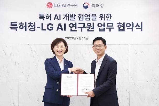 LG(003550)그룹 내 AI 연구원과 특허청은 14일 서울 강서구 마곡 LG사이언스파크에서 '특허 전용 초거대 AI 모델 구축을 위한 업무협약'을 체결했다고 밝혔다. LG AI 연구원과 특허청은 이번 협약을 통해 특허 문서의 검색과 분류, 요약 등 행정 서비스에 활용할 수 있는 '특허 전문가 AI'를 개발할 계획이다.