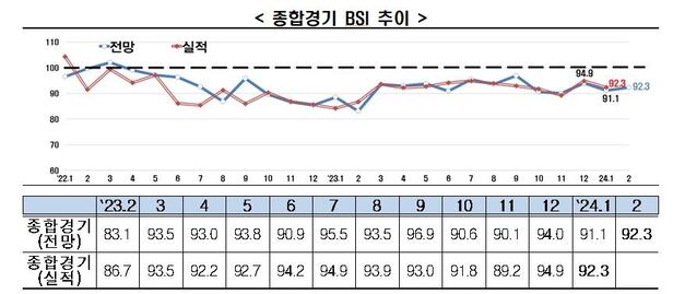 BSI는 기준치 100보다 높으면 긍정적인 경기 전망이 많고, 반대로 100보다 낮으면 부정적인 전망이 더 많다는 뜻이다. BSI 전망치는 지난 2022년 4월(99.1)부터 1년 11개월째 100을 밑돌고 있다.